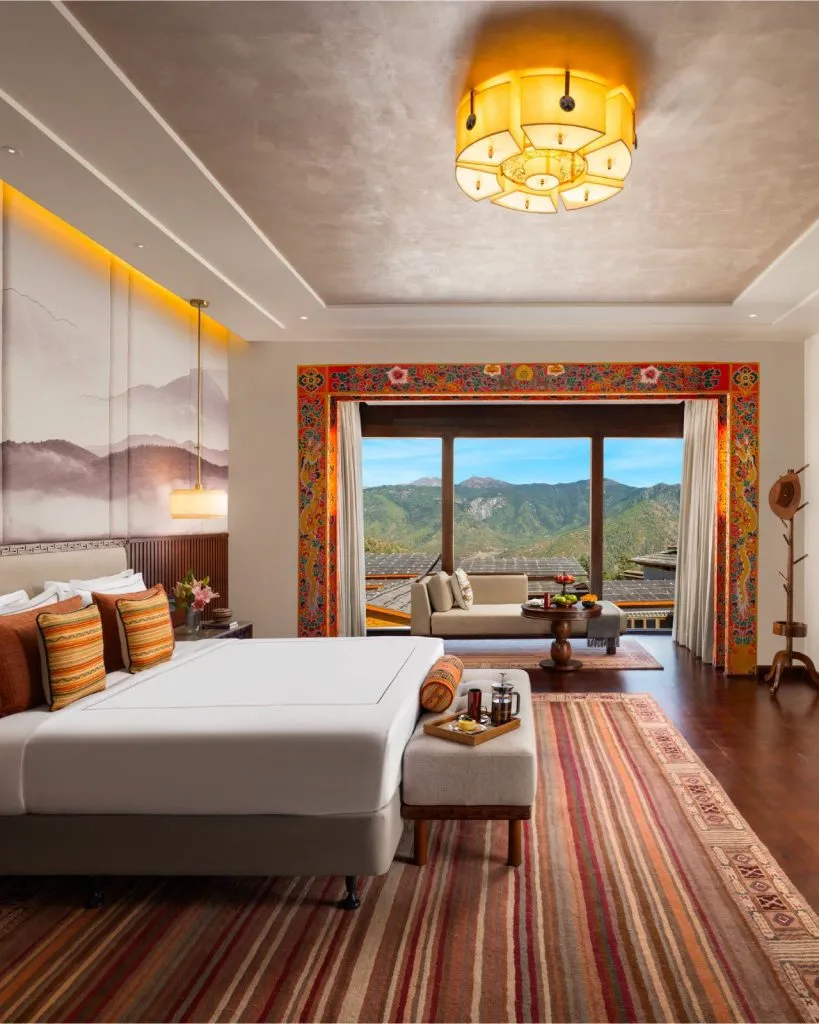 Guest rooms and suites are oriented toward the mountains, with large windows and balconies that keep the valley’s drama firmly in view. Inside, a warm, residential palette is layered with Bhutanese touches — think carved wood, traditional motifs, and textiles that subtly reference local craft — so the spaces feel rooted rather than generic. Modern comforts and well-appointed bathrooms ensure the stay remains firmly in the premium realm, while the overall mood stays calm, tactile, and unhurried.