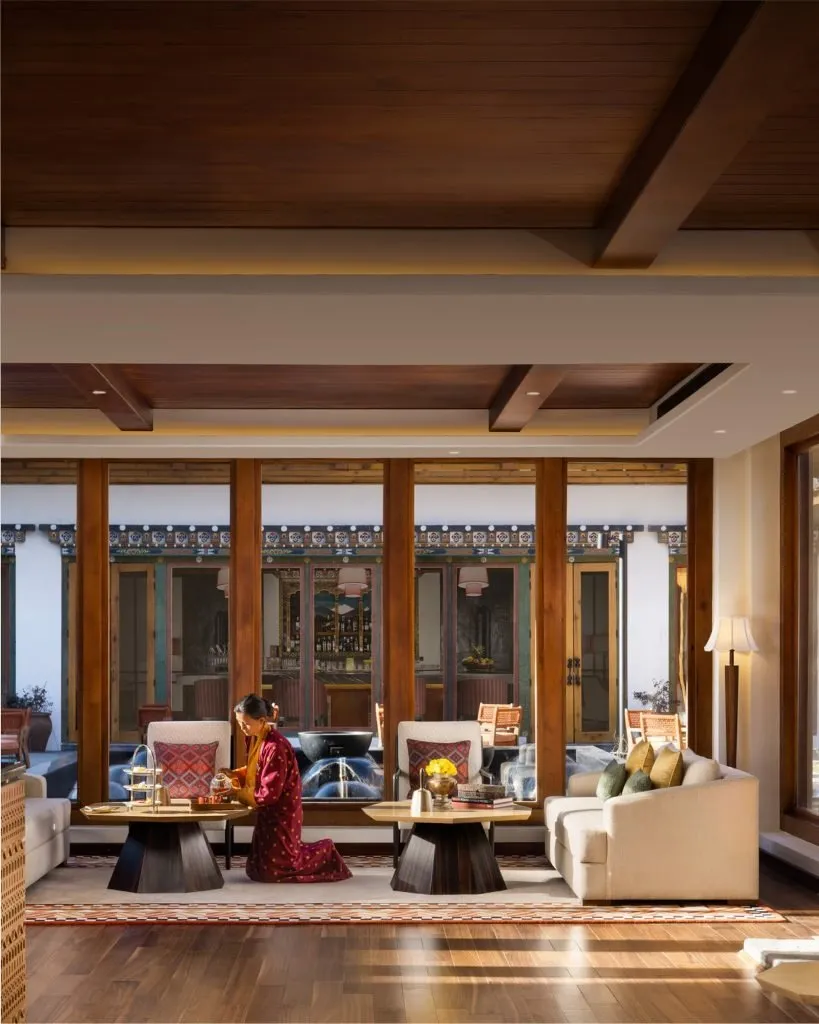 The lounge and bar provide a more intimate counterpoint, ideal for unwinding after a day of temple visits or hikes. Here, carefully crafted cocktails, Bhutanese wines, and teas are paired with small plates that nod to local tastes. The setting encourages lingering, whether watching the light fade over the hills or talking through the day’s encounters with monks, guides, and artisans.
